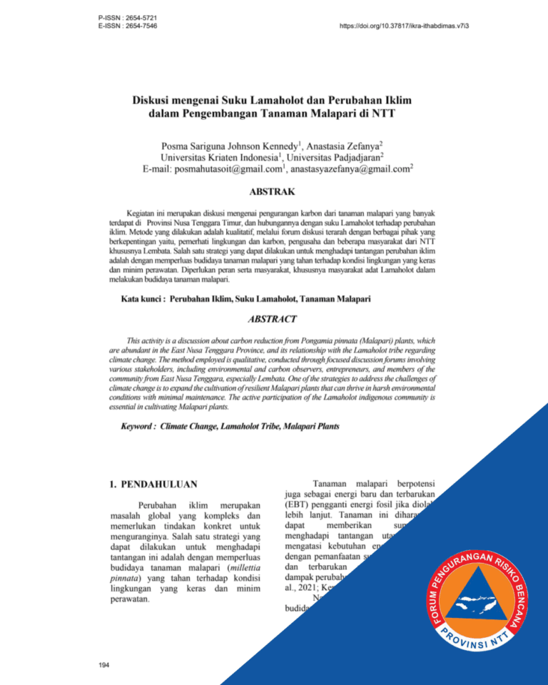 Artikel ini membahas keterkaitan antara masyarakat adat Suku Lamaholot dengan perubahan iklim, khususnya melalui pengembangan tanaman Malapari (Pongamia pinnata) di Lembata, Nusa Tenggara Timur. Diskusi menekankan peran masyarakat lokal dalam mitigasi karbon, pemanfaatan energi baru terbarukan, serta penguatan pengetahuan lokal untuk adaptasi iklim.