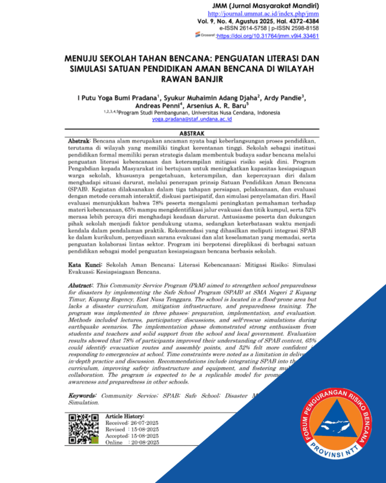Artikel ini membahas pelaksanaan Program Pengabdian kepada Masyarakat (PkM) oleh tim dosen Universitas Nusa Cendana dalam menerapkan prinsip Satuan Pendidikan Aman Bencana (SPAB) di SMA Negeri 2 Kupang Timur, Kabupaten Kupang, wilayah yang rawan banjir. Program ini bertujuan memperkuat kesiapsiagaan sekolah melalui literasi kebencanaan, pelatihan mitigasi risiko, dan simulasi penyelamatan diri. Kegiatan dilaksanakan dengan metode ceramah, diskusi partisipatif, dan simulasi evakuasi. Hasil evaluasi menunjukkan peningkatan signifikan dalam pemahaman, keterampilan, dan kepercayaan diri warga sekolah dalam menghadapi bencana. Artikel merekomendasikan integrasi SPAB ke dalam kurikulum serta penguatan kolaborasi lintas sektor untuk menjadikan sekolah lebih tangguh terhadap risiko bencana.