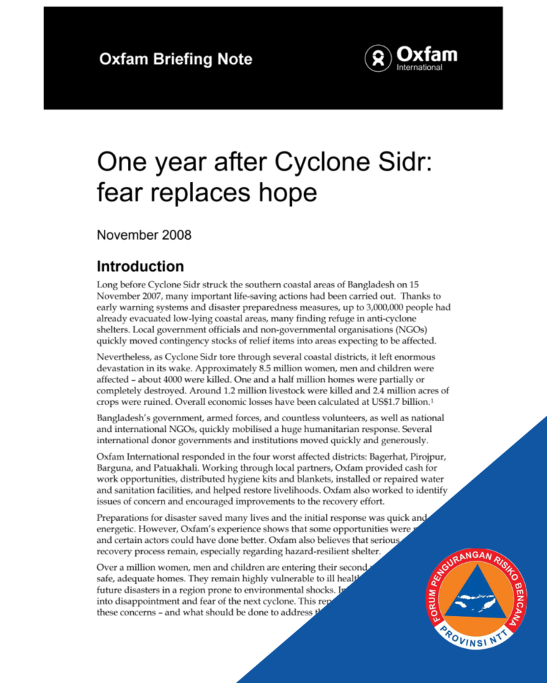 Dokumen ini merupakan briefing note Oxfam yang meninjau kondisi satu tahun pasca Cyclone Sidr (Bangladesh, 2007), salah satu bencana paling mematikan di Asia Selatan. Laporan ini mengulas keberhasilan sistem peringatan dini yang menyelamatkan jutaan jiwa, namun juga menyoroti kegagalan pemulihan yang meninggalkan lebih dari satu juta orang hidup di bawah shelter darurat yang rentan.