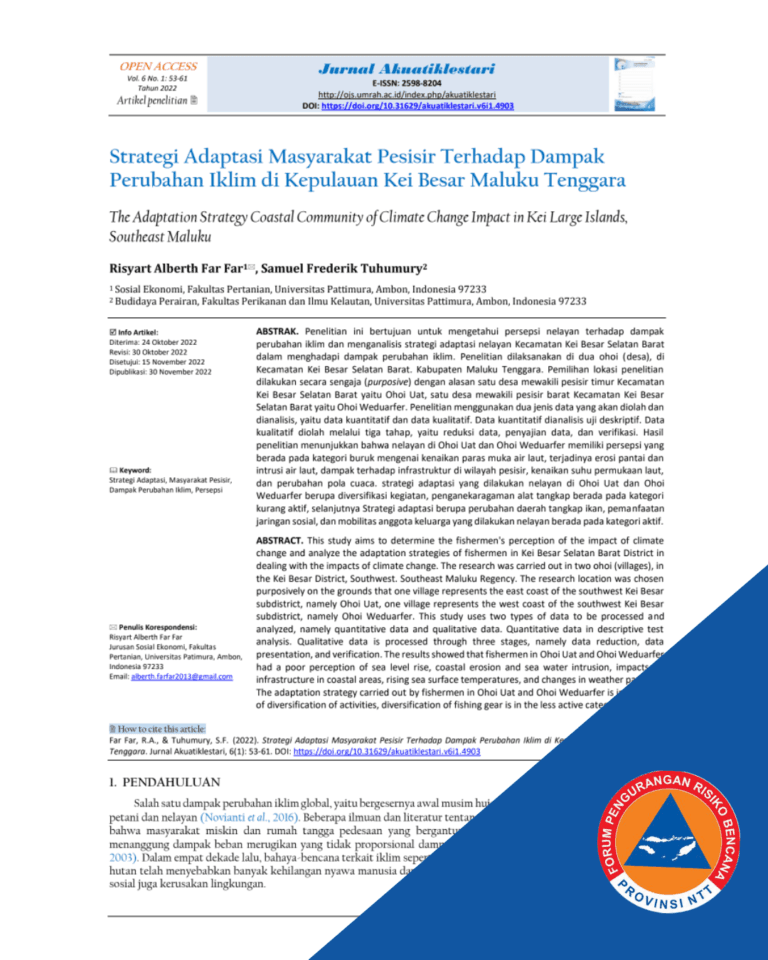 Artikel ini meneliti persepsi dan strategi adaptasi masyarakat pesisir terhadap dampak perubahan iklim di dua ohoi (desa) di Kecamatan Kei Besar Selatan Barat, yaitu Ohoi Uat dan Ohoi Weduarfer, Kabupaten Maluku Tenggara. Melalui kombinasi metode kuantitatif dan kualitatif, penelitian ini menemukan bahwa nelayan di kedua desa memiliki persepsi yang cenderung negatif terhadap dampak perubahan iklim seperti kenaikan muka air laut, erosi pantai, intrusi air laut, peningkatan suhu permukaan laut, dan perubahan pola cuaca. Strategi adaptasi yang dilakukan meliputi diversifikasi pekerjaan, penganekaragaman alat tangkap, perubahan wilayah tangkapan ikan, pemanfaatan jaringan sosial, serta mobilitas anggota keluarga. Hasilnya menunjukkan bahwa adaptasi sosial seperti gotong royong, jaringan kekerabatan (Ain ni Ain), dan kerja sama keluarga menjadi modal penting dalam ketahanan komunitas pesisir menghadapi perubahan iklim.